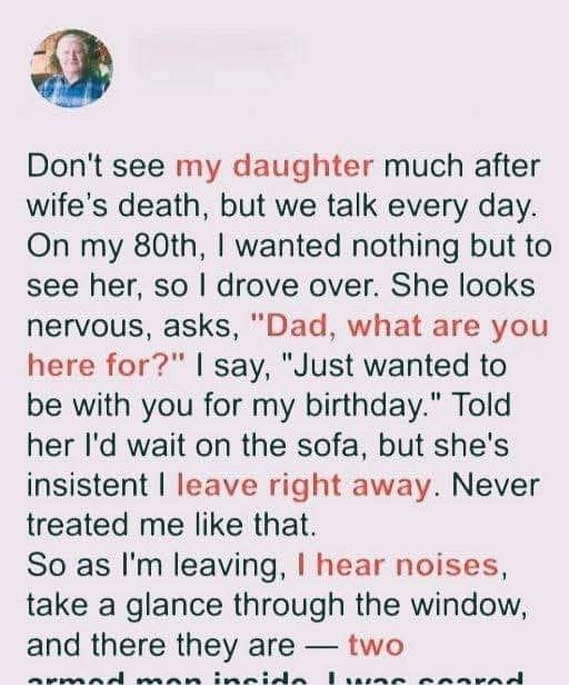 On my 80th birthday, I wanted nothing more than to see my daughter, so I decided to surprise her by driving over to her place. When she opened the door, she looked nervous and asked, “Dad, what are you here for?”
